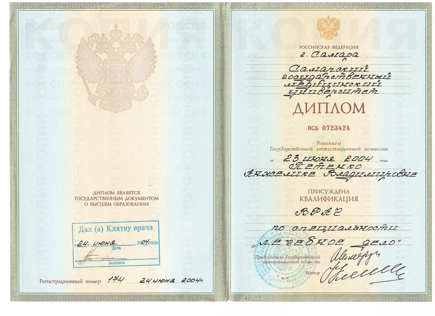 - 2004 — Самарский государственный медицинский университет (квалификация: по направлению "Лечебное дело");